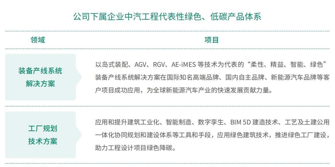 • 公司下属企业中汽工程编制《工程设计项目的绿色降碳解决方案》,引领指导绿色设计,推进碳足迹、碳边界、碳控相关技术研发与应用,基于多项创造性自主研发的科技创新技术,均着力打造数字化、智能化、绿色化的汽车工厂,推动汽车行业数智化、低碳化转型升级。